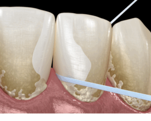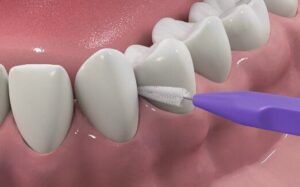 デンタルフロスは歯と歯が接している部分(隣接面といいます)に糸を通すことで、歯ブラシの毛先が届かない接面の食べかすや歯垢を落とす道具です。
