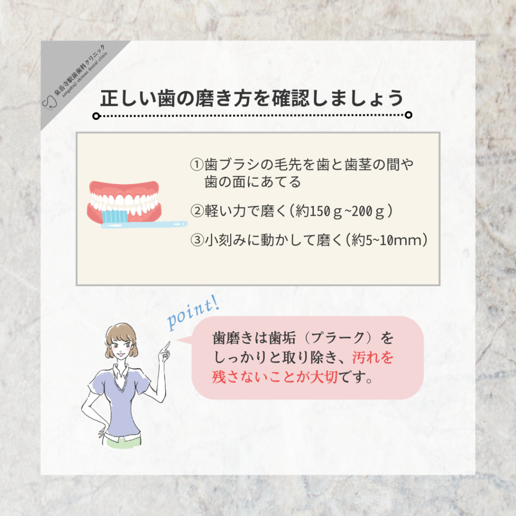 このタイミングに合わせて、正しい歯磨きの手順で歯を磨くことで、口腔の健康を維持しましょう。