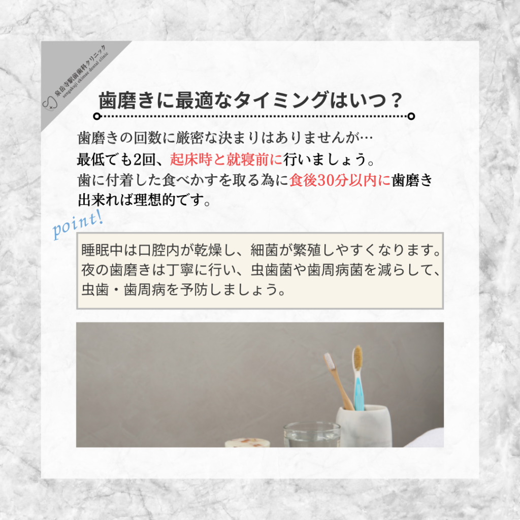 歯磨きのタイミングにはいくつかの重要なポイントがあります: