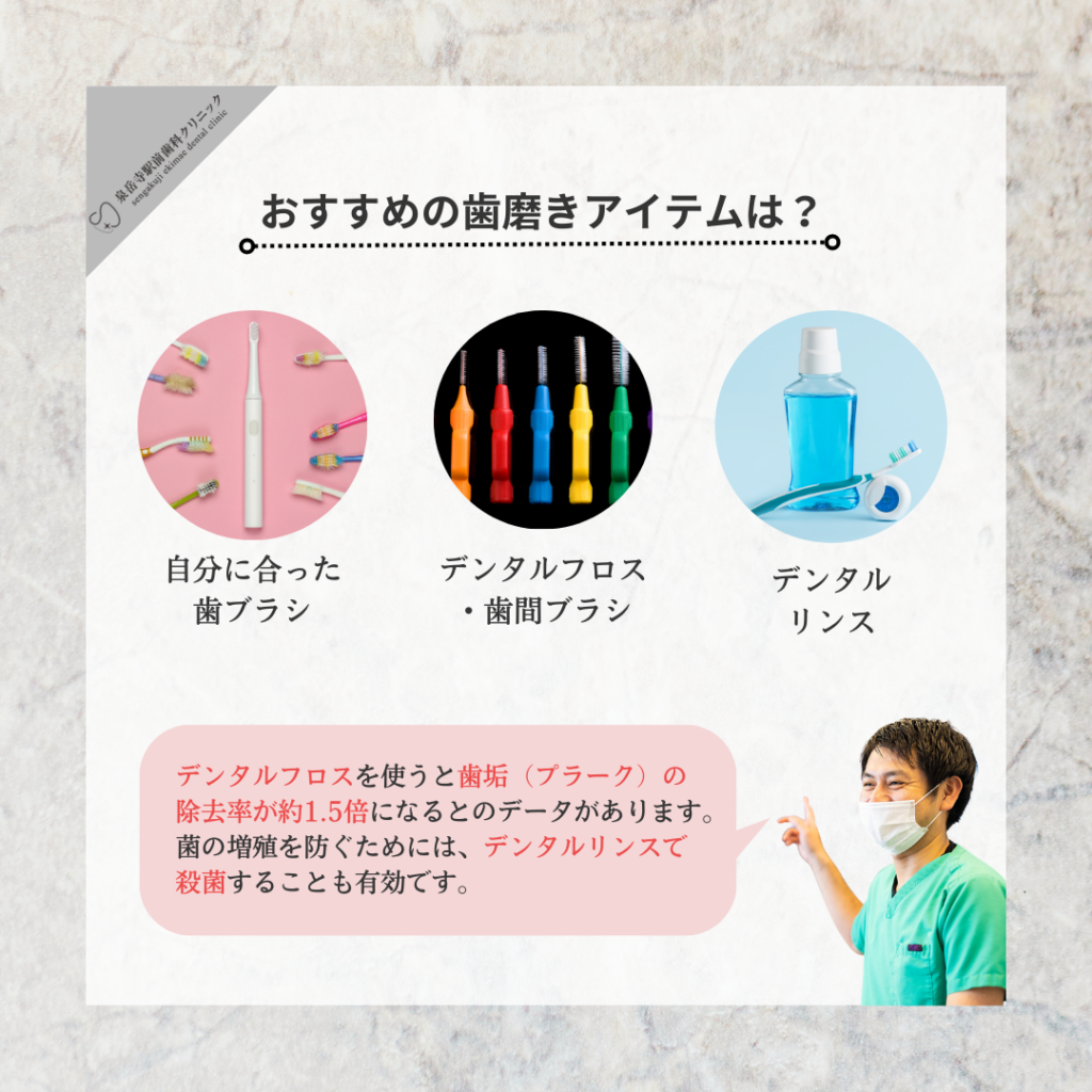 • 歯磨きと合わせてデンタルフロスや舌清掃も
